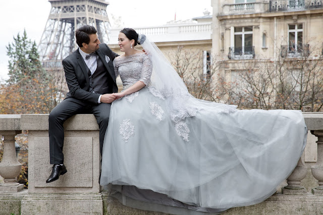 Madde bar en fantastisk brudklänning i grå/lila toner och matchade med en bukett av rosa Hortensior.
